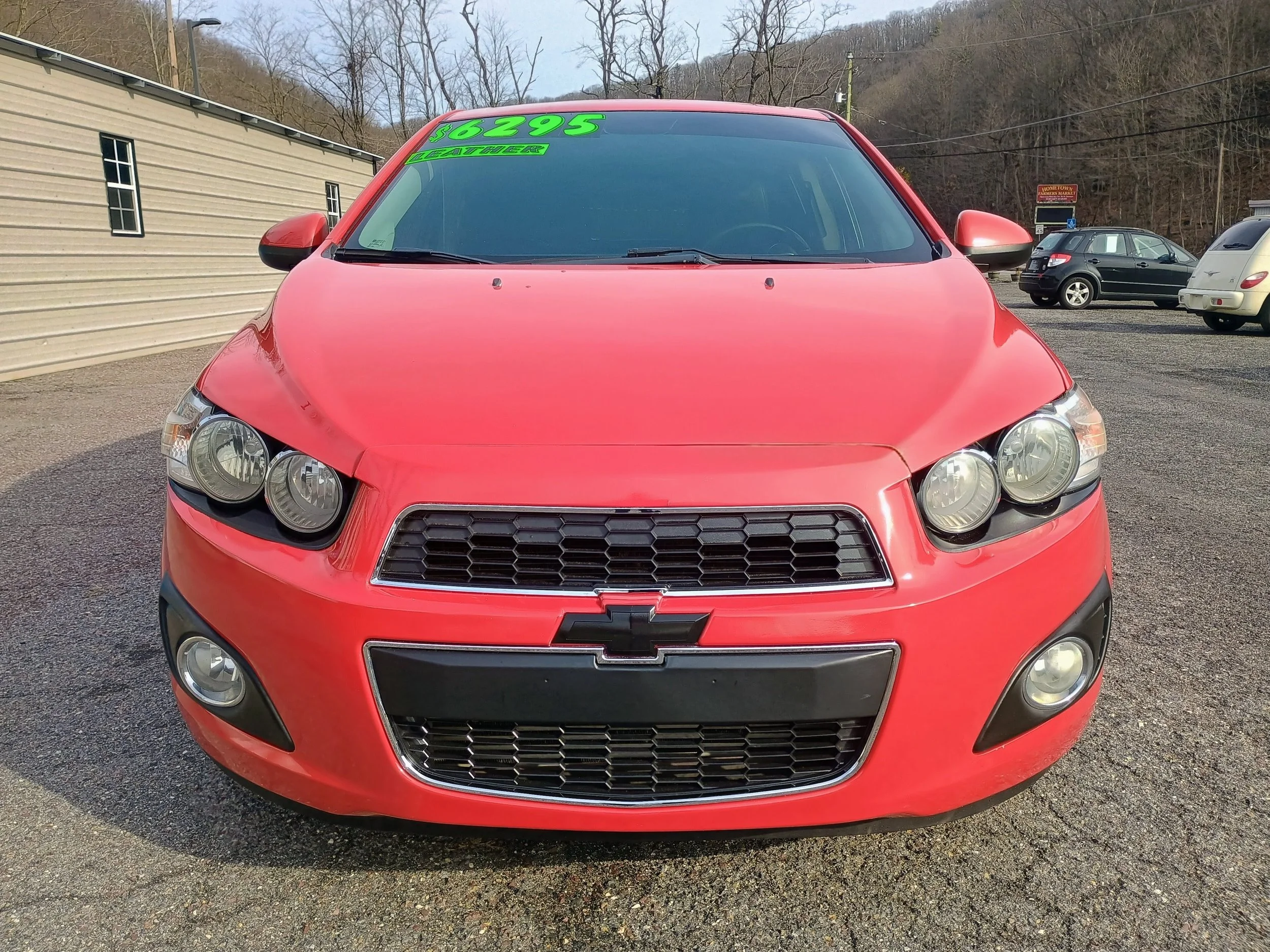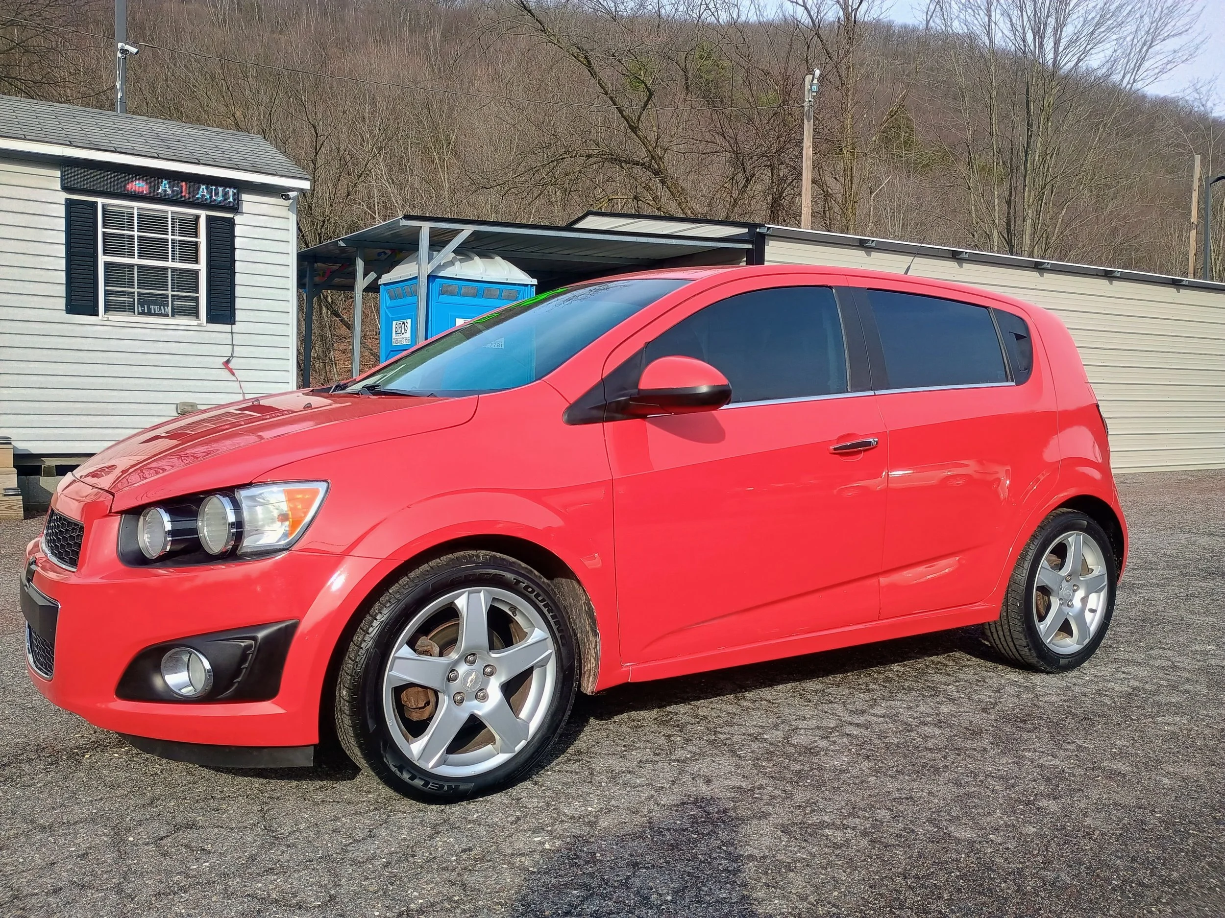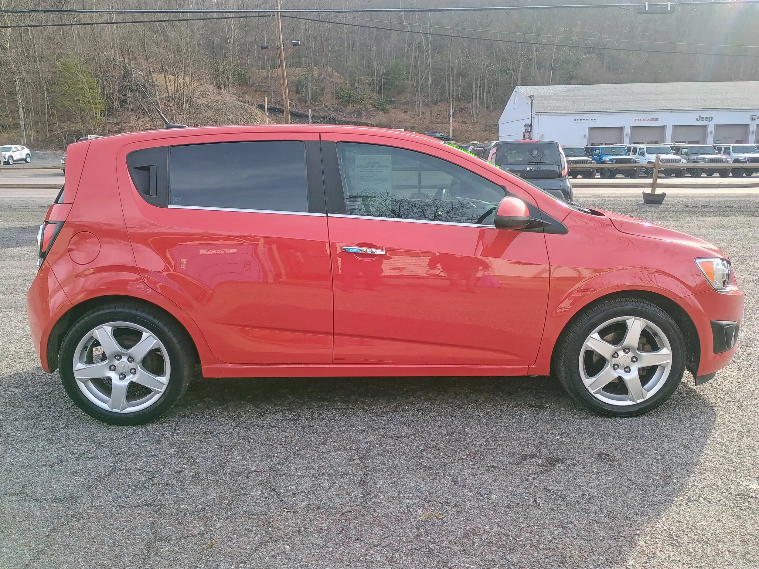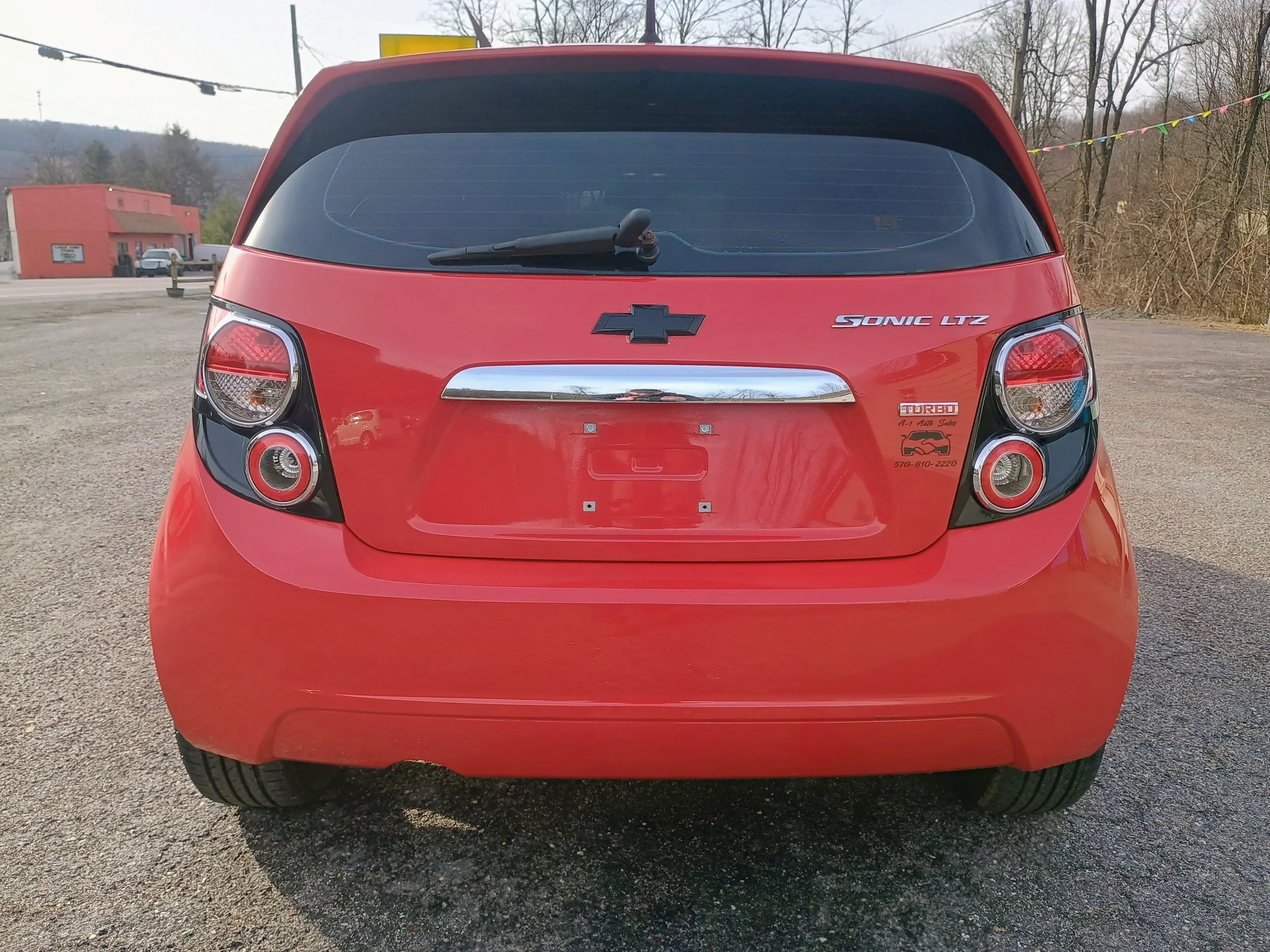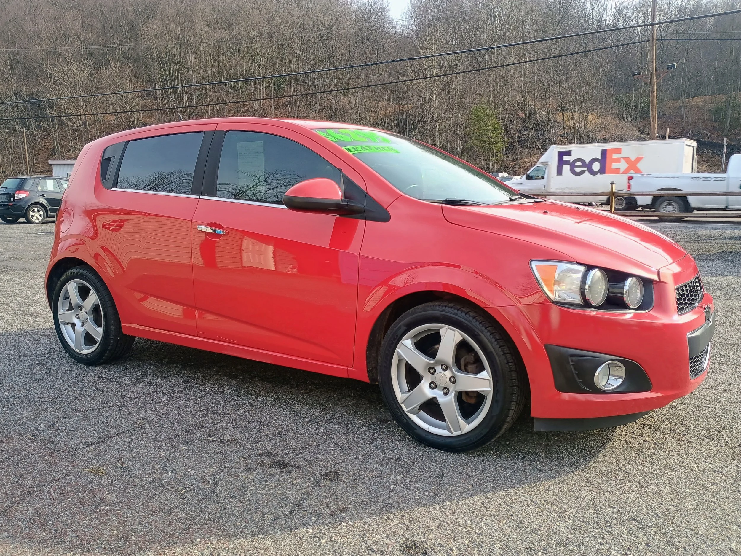 The LTZ trim package includes premium features such as heated leather seats, 17-inch aluminum wheels, Bluetooth connectivity, cruise control, steering wheel audio controls, and more. The bright red exterior paired with tinted windows and factory alloy wheels gives this Sonic a sporty appearance that really stands out.